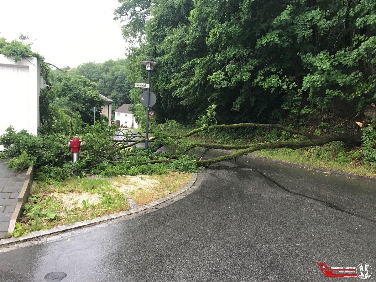 Gegen 6:30 Uhr am heutigen Morgen folgte eine weitere Alarmmeldung. Aufgrund des aufgeweichten Untergrunds kippte in der Stinkelbrunnstraße, Kreuzung Turmblick ein Baum auf die Fahrbahn und streifte dabei eine Fahrzeuggarage. Der Baum wurde zusammen mit dem örtlichen Bauhof und einer Motorsäge entfernt.