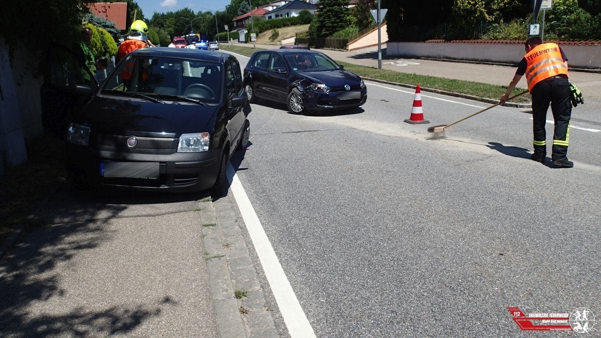 Am heutigen Donnerstagmittag alarmierte uns die ILS Landshut in die Regensburgerstraße mit dem Stichwort ''VU mit Personenschaden''. Aus bisher ungeklärter Ursache kollidierte ein Kleinwagen der Marke Fiat mit einem Golf im Kreuzungsbereich. Wir banden die ausgelaufenen Betriebsstoffe und übernahmen die Verkehrsabsicherung. Die beteiligten Personen kamen mit dem Schock davon.