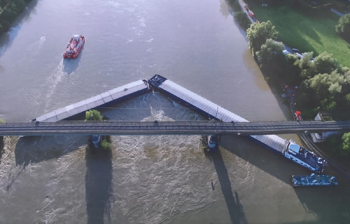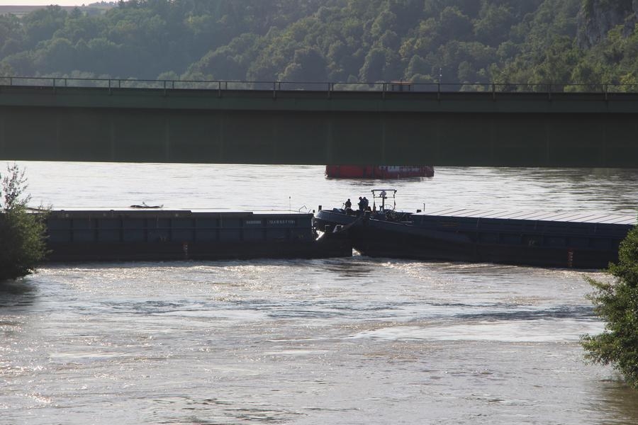 Die zweite große Alarmmeldung an diesem Tag lautete "Kollision Frachtschiff" auf der Donau. Die Integrierte Leitstelle Landshut alarmierte um 16:10 Uhr ein Großaufgebot an Einsatzkräften an Donau bei Poikam. Aus ungeklärter Ursache havarierte ein mit Stahl beladener Schubverband und kollidierte mit einer über die Donau führende Eisenbahnbrücke. Die Crew des Havaristen wurde mittels einer Drehleiter gerettet. Glücklicherweise schlug das Schiff nicht Leck, so dass keine Gefahr des Sinkens bestand. Durch die Einsatzkräfte der Feuerwehr wurden Verkehrssperrungen und Umleitungen eingerichtet. Eine Sperrung der Bahnlinie Regensburg - Ingolstadt leitete der Deutsche Bahn Notfallmanager ein.