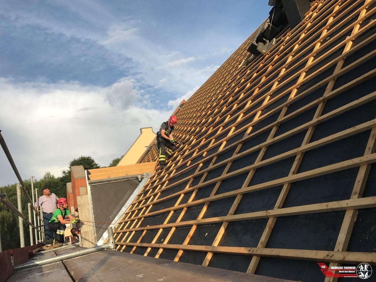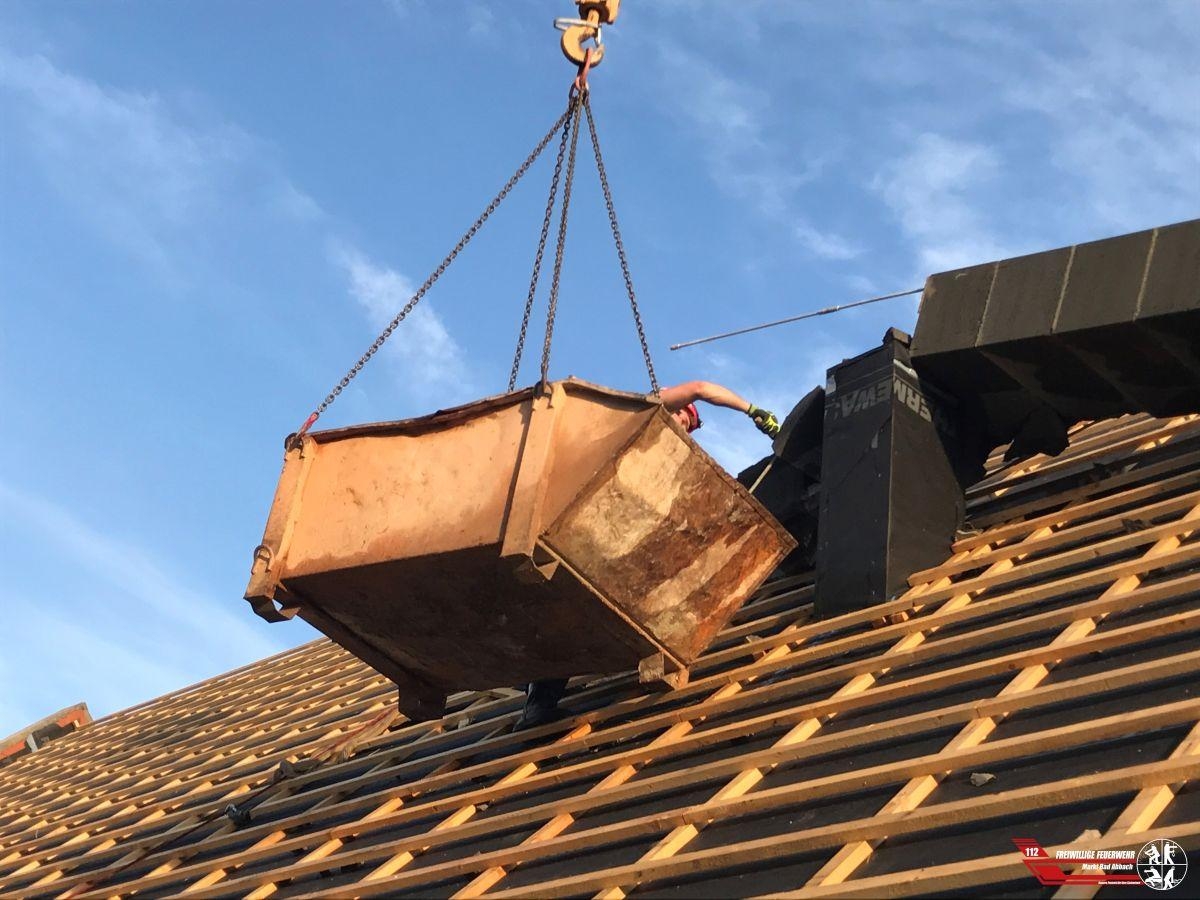 Auf einem Neubau kippte aufgrund des Unwetters ein Kamin um. Mithilfe des Absturzsicherungssatzes und des vorhandenen Baukran, wurde der Kamin abgetragen und mittels einer Schuttmulde zum Boden transportiert. Nach rund zwei Stunden konnten wir den Einsatz beenden.