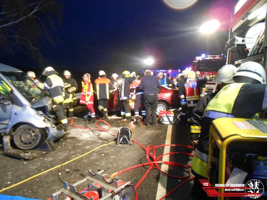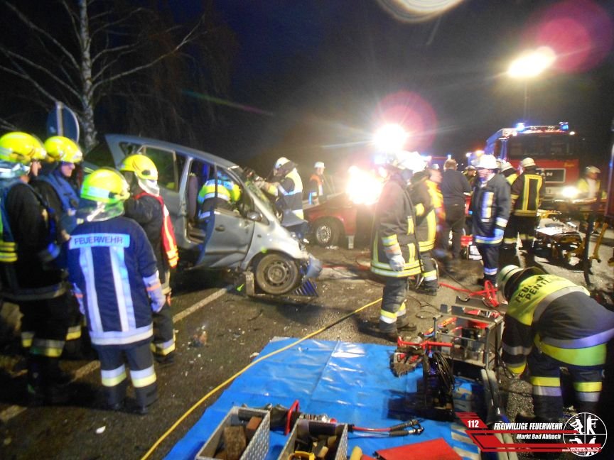 Um 18:24 Uhr wurden wir zu einem schweren Verkehrsunfall, mit eingeklemmten Personen auf die Bundesstraße 16 höhe der Ortschaft Graßlfing alarmiert. Aus bisher ungeklärter Ursache kollidierten zwei Pkw frontal miteinander. Zusammen mit den Kollegen der Feuerwehr Pentling und Graßlfing wurden zwei Personen schwerverletzt mittels Rettungssatz befreit. Eine weitere Person konnte ohne schweres Gerät das Fahrzeug verlassen. Die Polizei beauftragte einen Gutachter, um den Unfallhergang zu rekonstruieren. Nachdem die Ermittlungen, sowie die Reinigung der Fahrbahn abgeschlossen war, konnten wir nach circa vier Stunden die Einsatzstelle wieder verlassen.