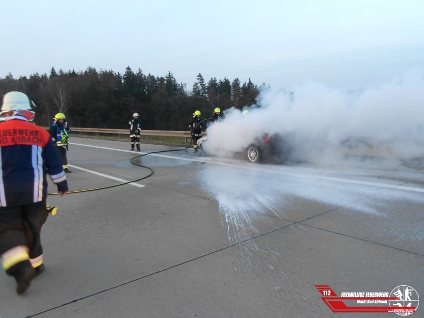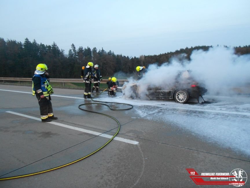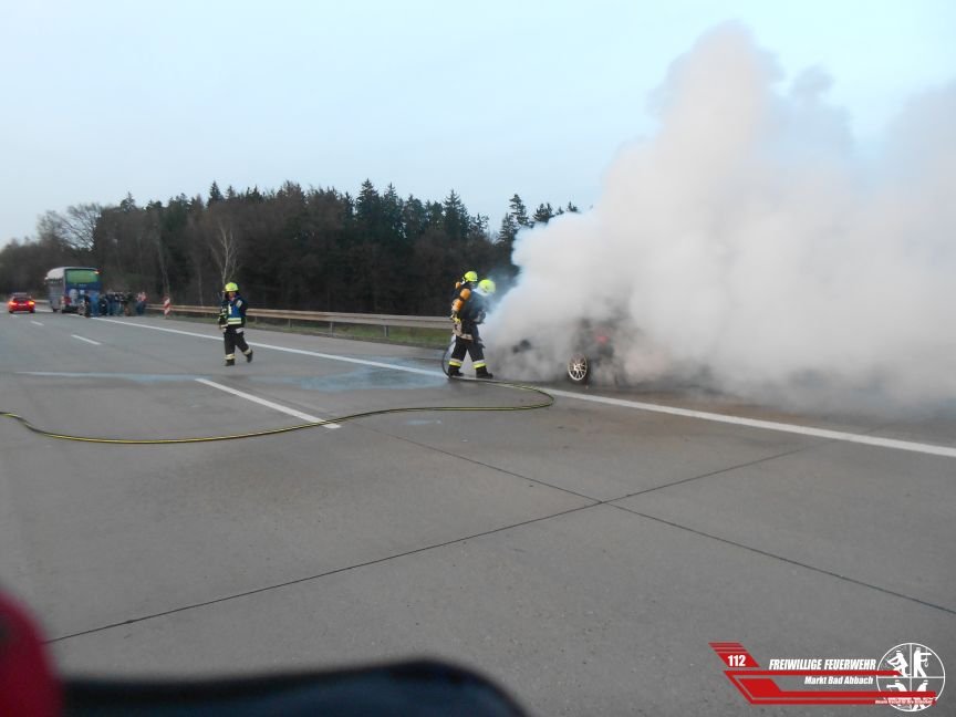 Erneut wurden wir zu einem brennenden Pkw auf die Autobahn A93, Fahrtrichtung Regensburg alarmiert. Beim Eintreffen wurde der Vollbrand eines VW Golf 4 festgestellt. Ein Trupp unter schwerem Atemschutz begann sofort mit einem Schnellangriffschaumrohr das Feuer unter Kontrolle zu bringen. Nach circa 10 Minuten konnte ,,Feuer aus" gemeldet und das ausgebrannte Fahrzeug mittels Wärmebilkamera auf weiteren Gefahrenstellen untersucht werden. Zusammen mit den Kollegen der Feuerwehr Pentling wurde die Absicherung und Verkehrsleitung übernommen. Die Autobahn A93 war für eine Stunde einseitig gesperrt. Nachdem das Wrack von einem Abschleppunternehmen abtransportiert und die Einsatzstelle gereinigt war, konnten alle Kräfte abrücken.